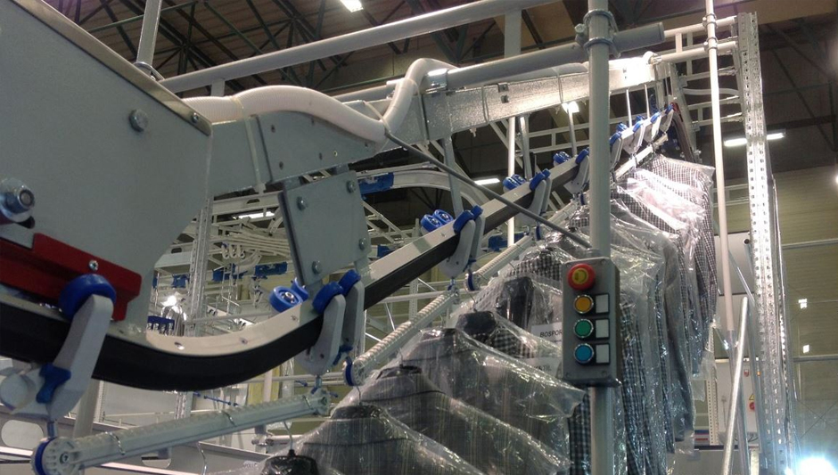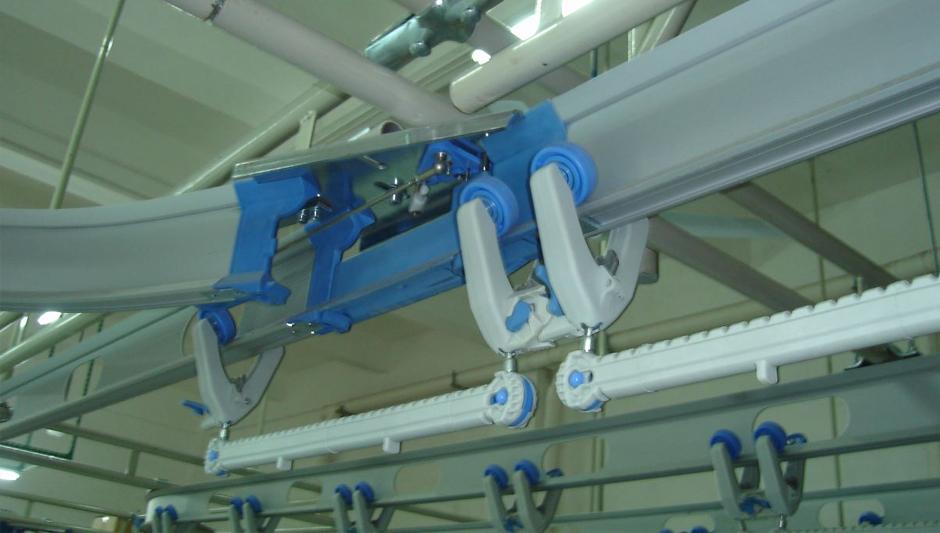 推車輸送線包含了軌道與推車,推車通過在軌道上進行運動從而對懸掛的物料進行傳輸。